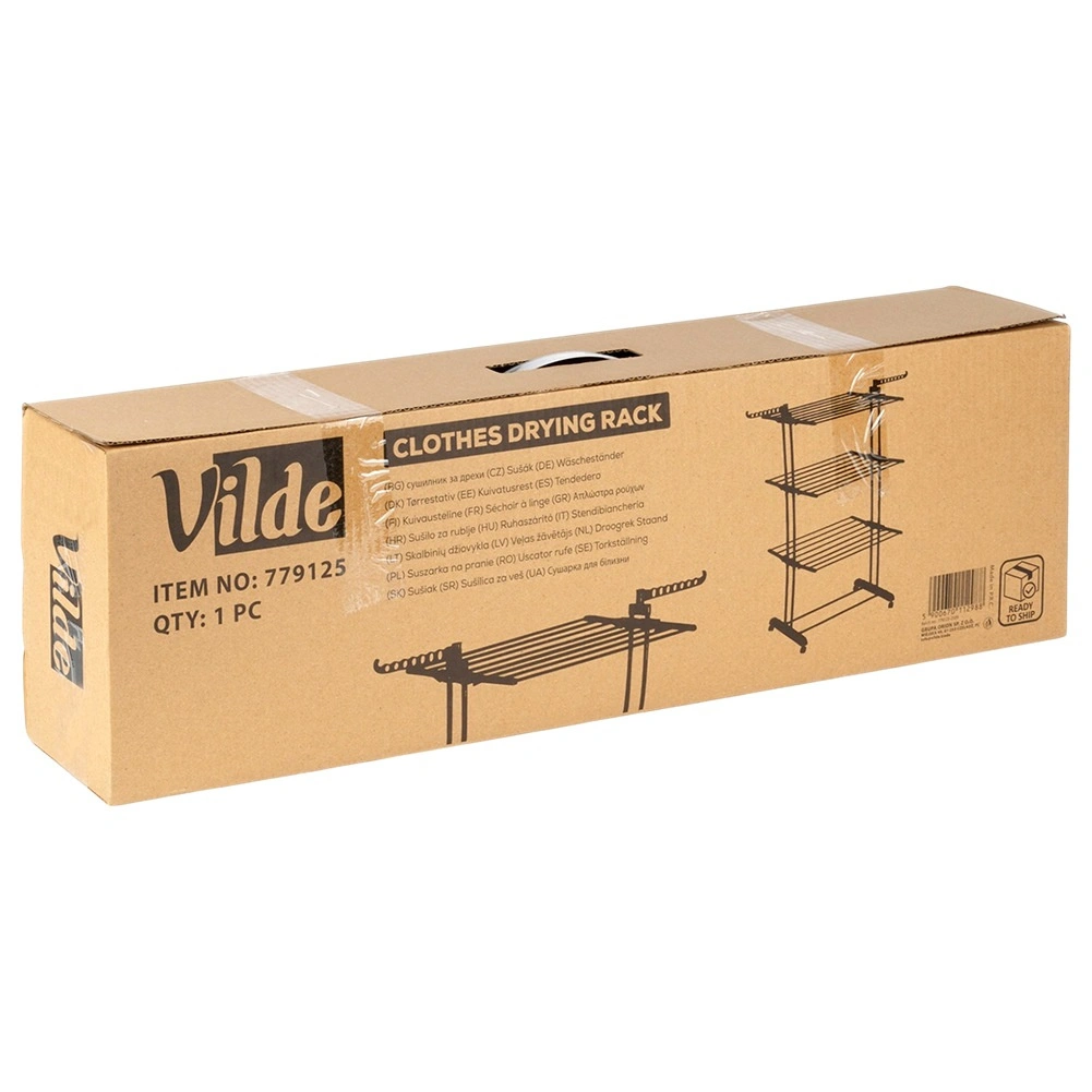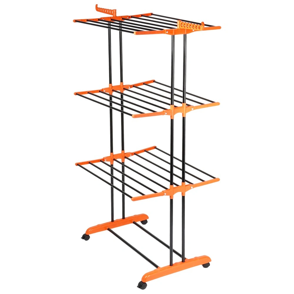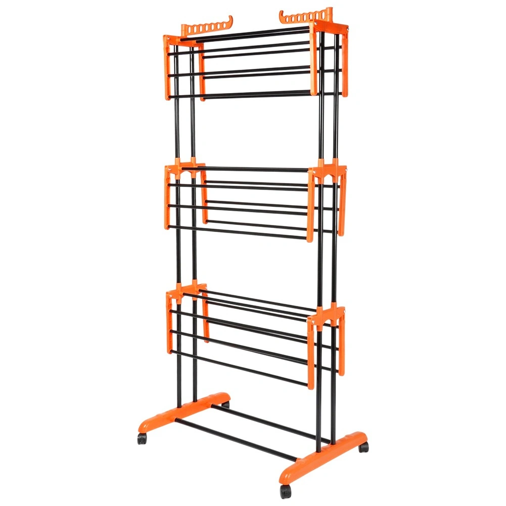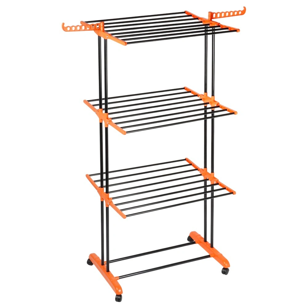 Navpično stojalo Vilde s tremi nivoji učinkovito prihrani prostor in vam omogoča sušenje velike količine perila na minimalni površini. Kovinske palice s prašnim premazom v črni barvi so odporne na vlago, oranžni plastični spojni elementi pa zagotavljajo stabilnost in dolgo življenjsko dobo. Razdalja 50 cm med nivoji izboljšuje kroženje zraka in pospeši sušenje.