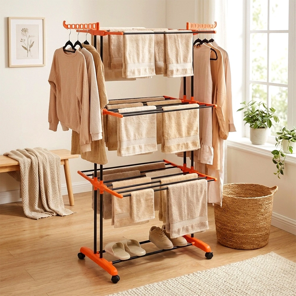 Praktično tristanjsko stojalo za sušenje perila z robustno kovinsko konstrukcijo in kolesi za enostavno premikanje. Ponuja do 16,5 m sušilne površine, 24 trdnih palic, zložljiva krila in stranska nosilca za obešalnike za maksimalni izkoristek prostora. Zahvaljujoč stabilnemu okvirju in dvema zavorama na kolesih je idealen za stanovanje, balkon ali teraso.