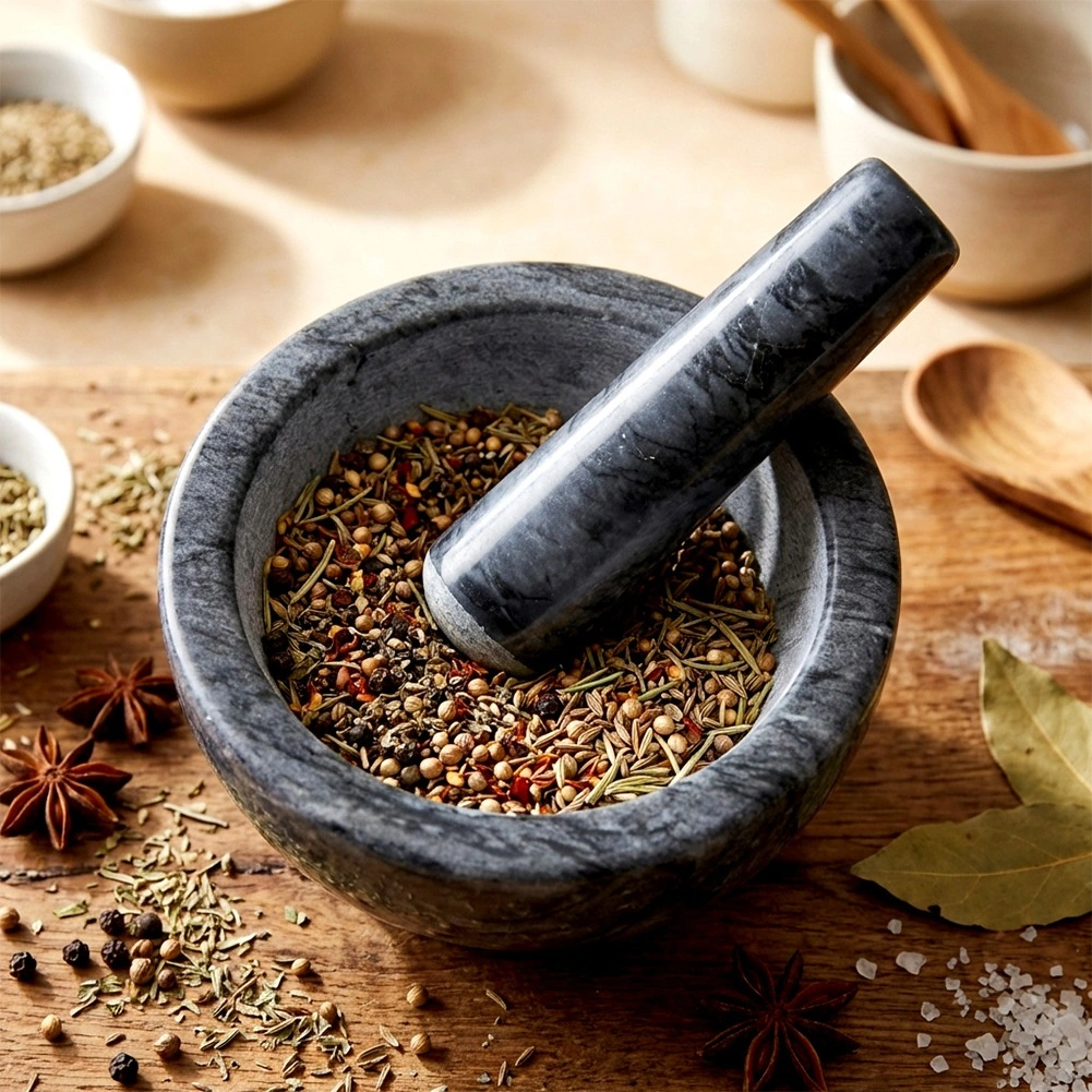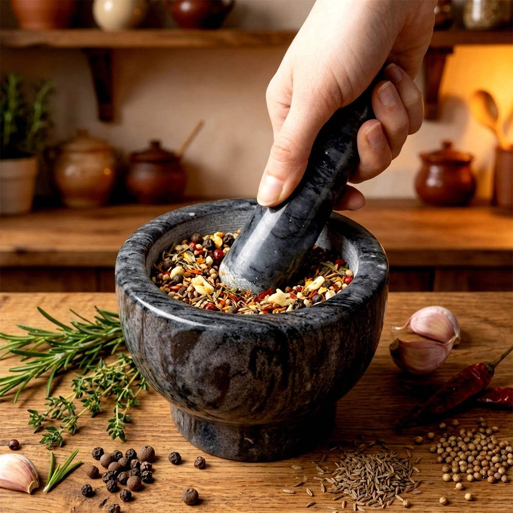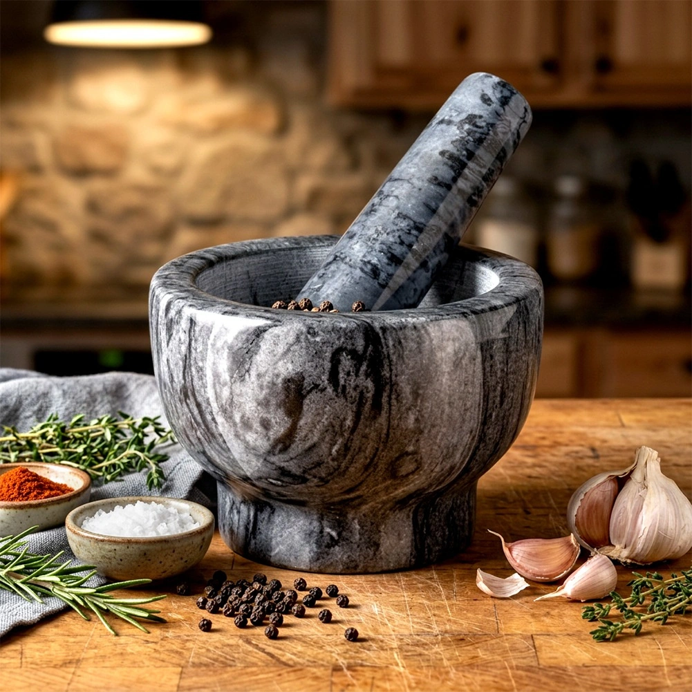 Odkrijte moč tradicionalnega mletja z granitnim možnarjem premera 13 cm. Naravni kamen naravno poudari aromo sveže zdrobljenih začimb, česna ali zelišč ter pomaga ustvarjati paste in domači pesto. Notranja, nepolirana površina sklede in spodnji del tolkača zagotavljata večje trenje in s tem hitrejše, enakomernejše drobljenje.