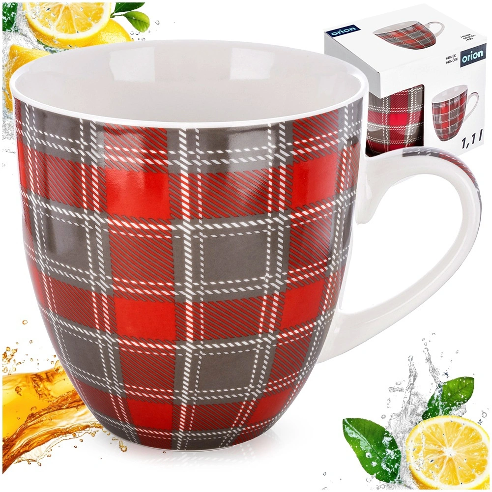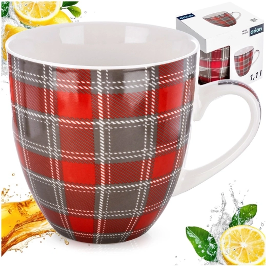 Velika porcelanasta skodelica s prostornino 1 liter z udobnim ročajem in stylskim karirastim vzorcem v rdeče‑sivi barvi. Idealna za kavo, čaj in kakav, primerna za pomivalni stroj in mikrovalovno pečico. Kakovosten porcelan zagotavlja dolgo življenjsko dobo in varen stik z živili.