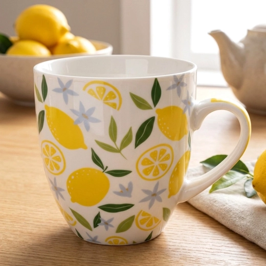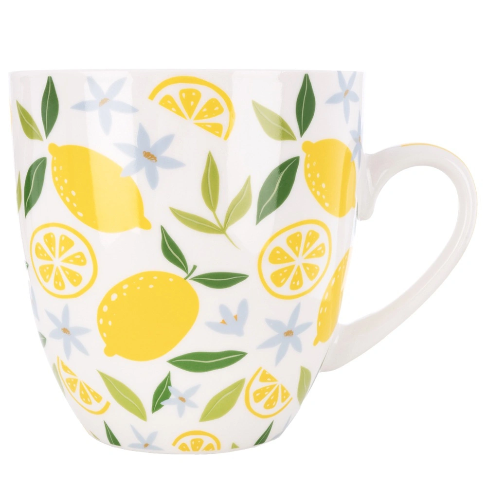 Uživajte priljubljen napitek v veliki porciji. To porcelanasto skodelico 1 l v beli barvi krasi trendi limonast dekor, ki poživi vsako mizo in v notranjost vnese lahkotnost ter dobro voljo. Zahvaljujoč ergonomskemu ročaju se udobno drži tudi, ko je popolnoma napolnjena.