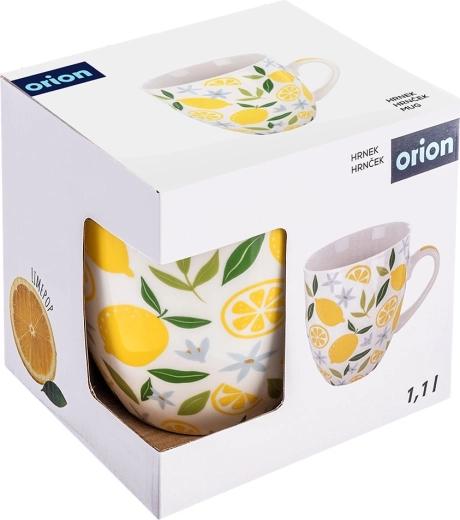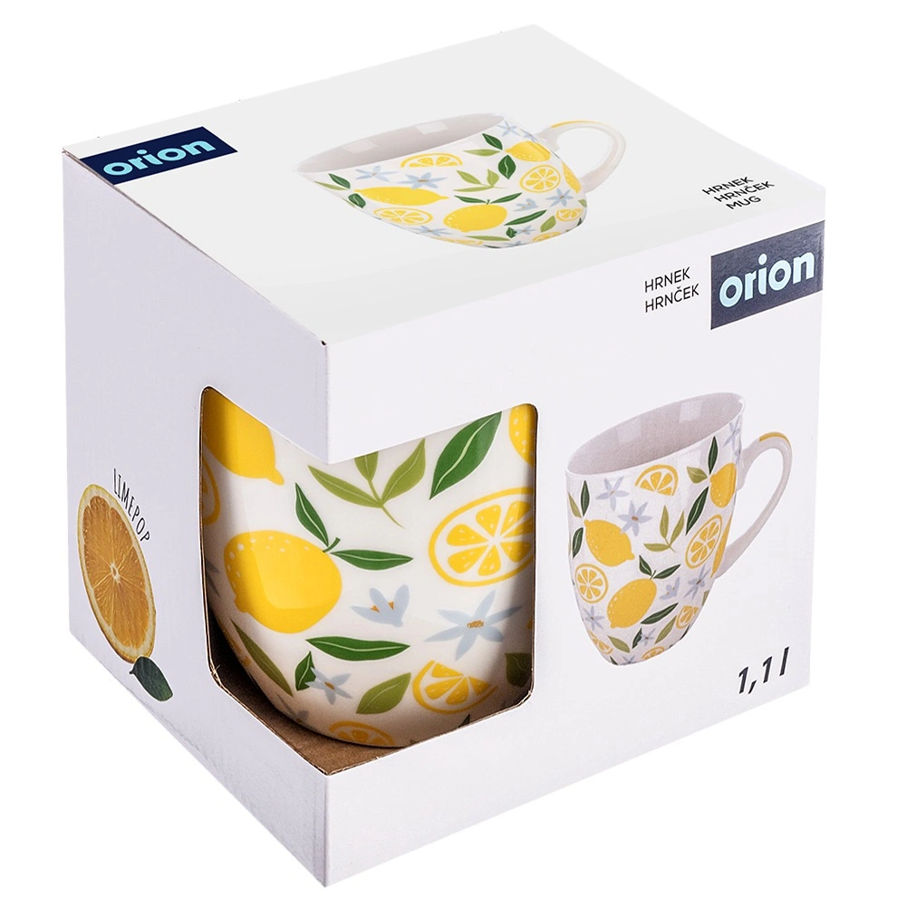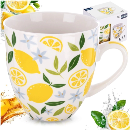 Velika porcelanasta skodelica XXL s prostornino 1 l z veselým motivom limon je idealna za kavo, čaj, kakav in hladne napitke. Ima udoben ročaj, je primerna za pomivalni stroj in mikrovalovno pečico ter zahvaljujoč kakovostni porcelanasti glazuri nudi dolgo življenjsko dobo in varen stik z živili.