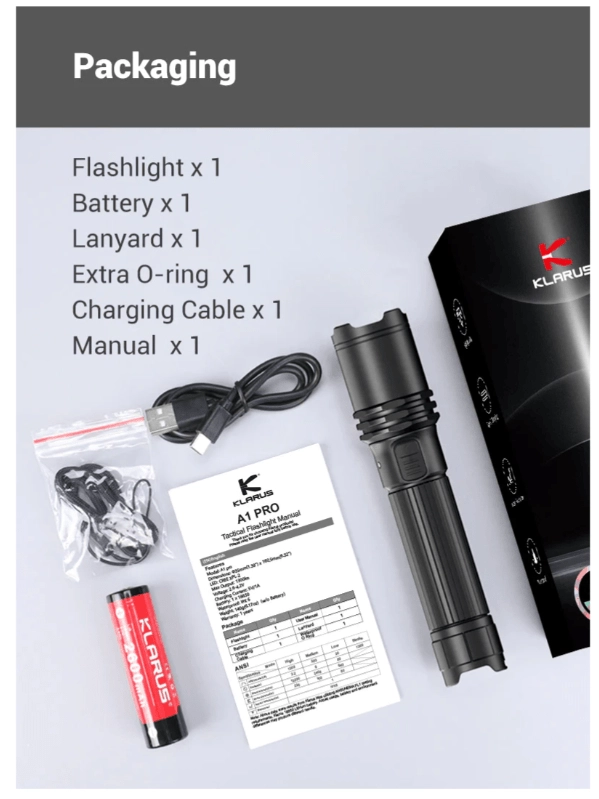Kompaktna, zmogljiva in zanesljiva. Taktična svetilka Klarus A1 Pro ponuja do 1300 lumnov dnevno belega svetlobo z dosegom 230 metrov. Robusten trup iz letalskega aluminija odlično kljubuje zahtevnim pogojem pri službi, na terenu in doma, dvojno stransko stikalo pa omogoča zanesljivo upravljanje tudi z rokavicami.