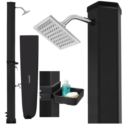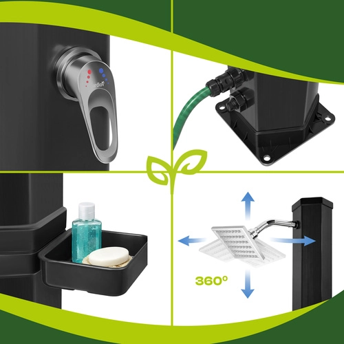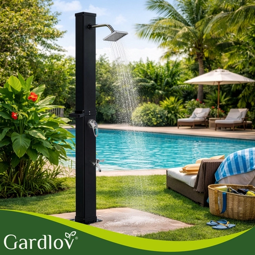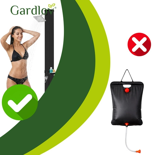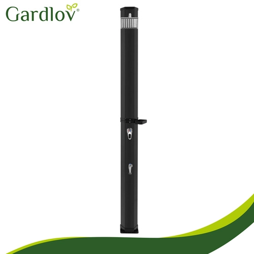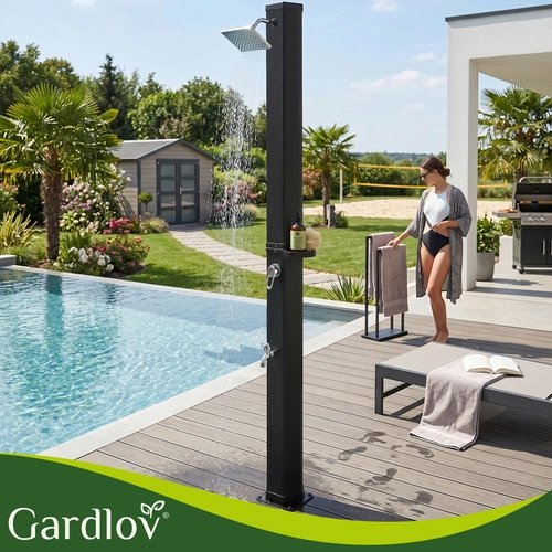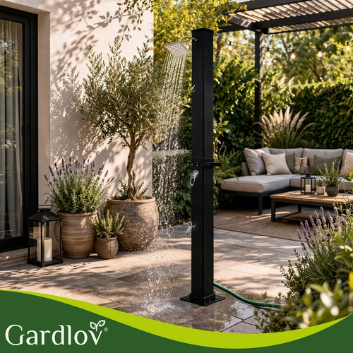 Sončna prha GARDLOV je pametna in okolju prijazna rešitev za vsakogar, ki želi toplo vodo brez elektrike. S pomočjo sončne energije segreje zalogo vode do 60 °C, zato si lahko privoščite udobno prhanje po kopanju v bazenu, delu na vrtu ali športu. Sodobna zasnova z 360° vrtljivo deževno glavo in stabilno samostoječo konstrukcijo se odlično poda v vsak zunanji prostor.