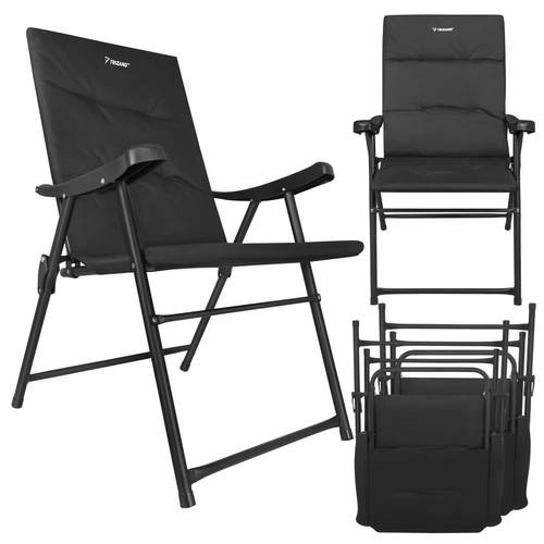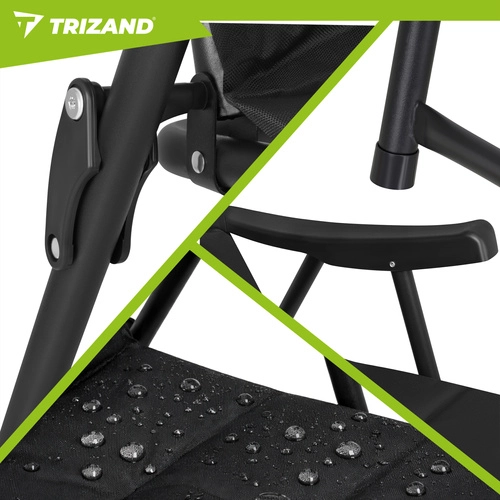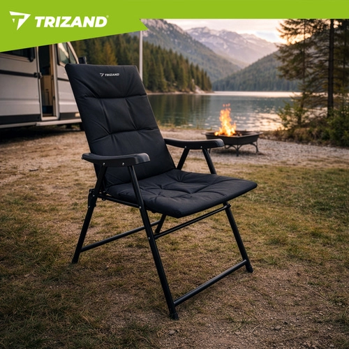 Set dveh zložljivih kamping stolov TRIZAND je idealen za vrt, kampiranje, ribolov in peko na žaru. Ponuja visok naslonjalo, široka naslonjala za roke in mehak sedež za udoben počitek. Zahvaljujoč zložljivi konstrukciji se enostavno prenašajo in shranjujejo, medtem ko ojačani trakovi in protizdrsne nogice zagotavljajo stabilnost in varnost. Vsak stol prenese do 100 kg.