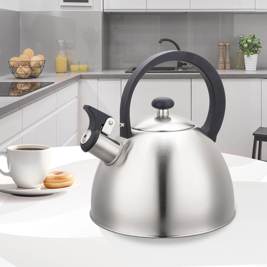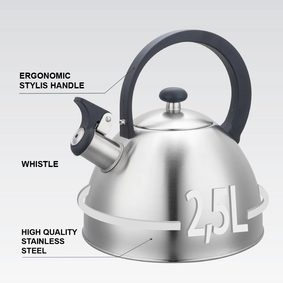 Iščete vzdržljiv in stilski čajnik za vsak dan? Ta nerjavni čajnik MAESTRO ponuja prostoren volumen 2,5 litra, zato lahko hkrati pripravite vroče napitke za vso družino. Piščalka vas zanesljivo opozori na vrelišče, medtem ko ergonomski ročaj zagotavlja varno in udobno nalivanje.