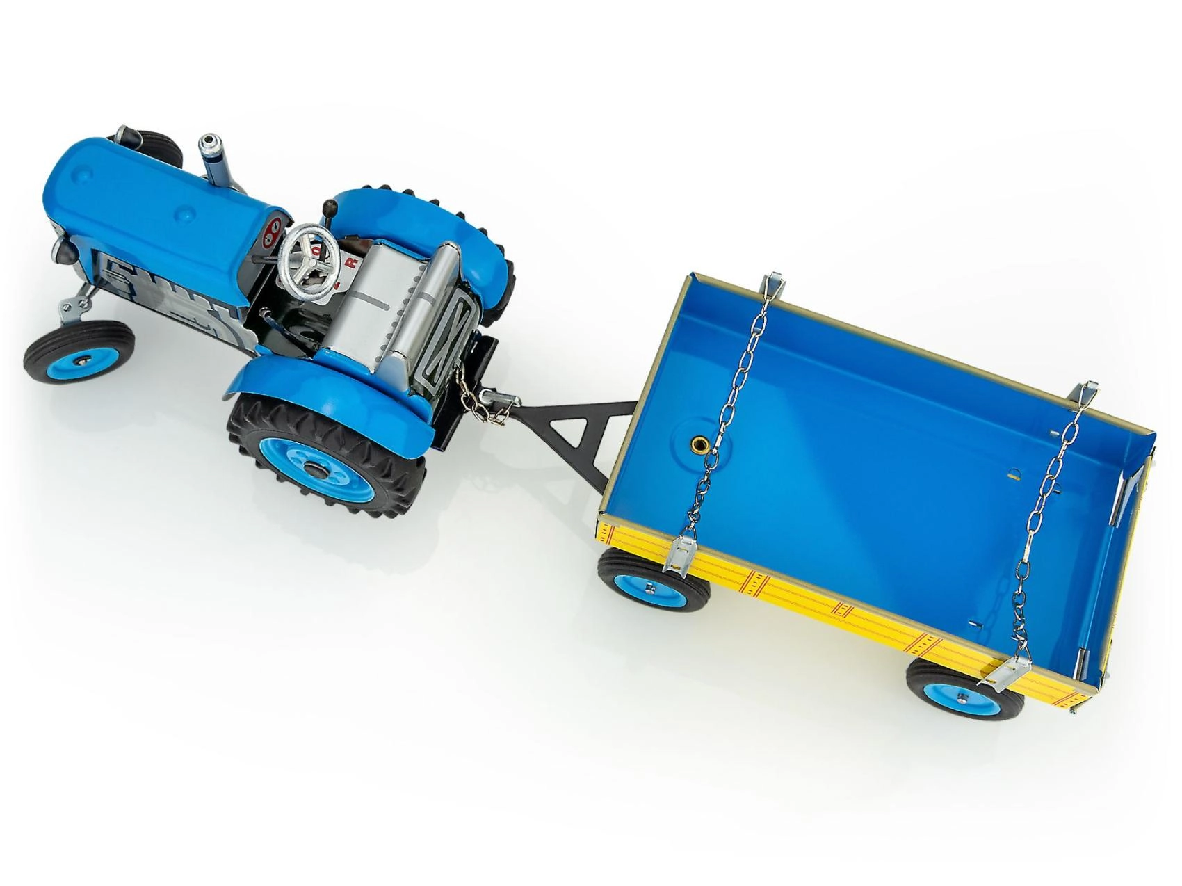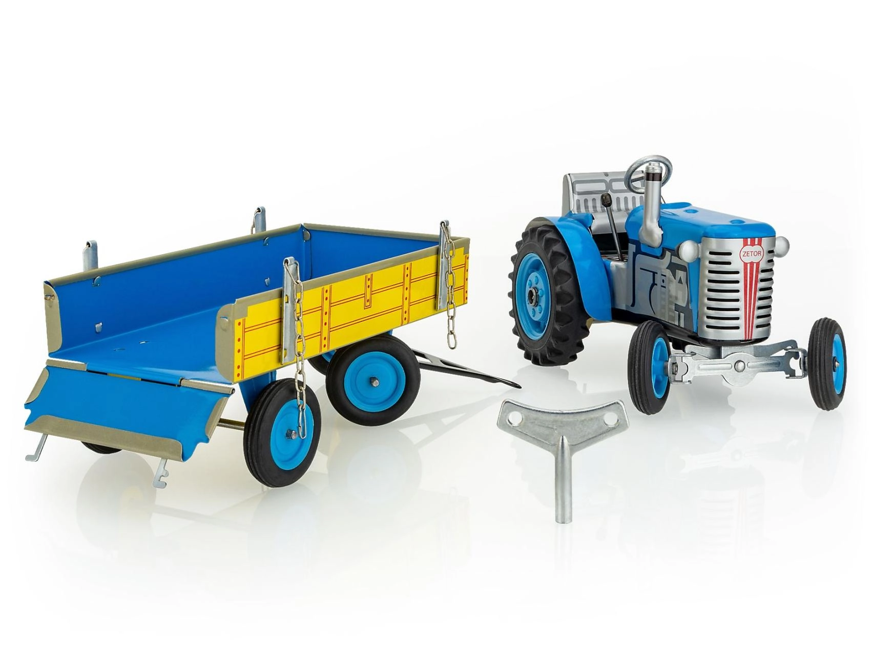 Kovinski traktor ZETOR s prikolico na navijalni ključ bo navdušil male in velike ljubitelje klasičnih igrač. Ponuja delujoč menjalnik s 3 prestavami naprej, vzvratno prestavo in prosto prestavo, ne manjka niti ročna zavora. Kakovostna kovinska izdelava v merilu 1:25 in dolžina 28 cm zagotavljata vzdržljivost in realističen igralni užitek.