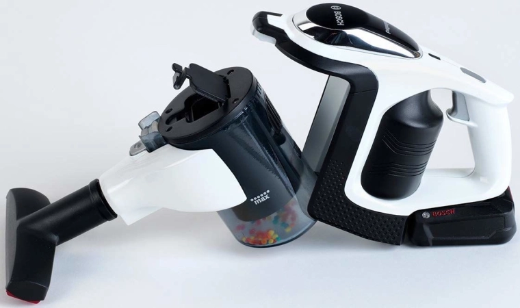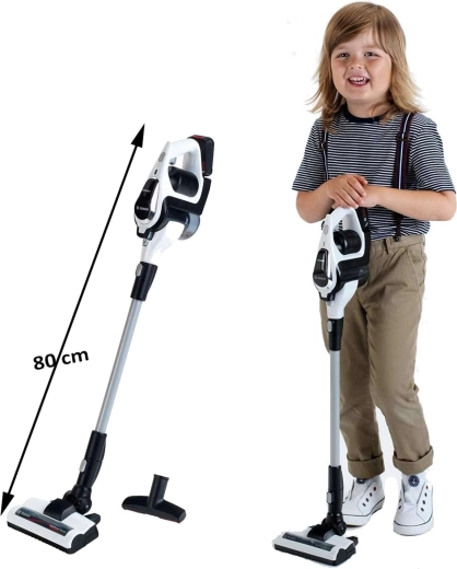 Avtentični otroški sesalnik BOSCH Unlimited v belo‑črni izvedbi s srebrno cevjo verno posnema pravi aparat. Zaradi LED-osvetlitve in vrtečih se kroglic v prozornem zbiralniku deluje pri “sesanju” zelo realistično, hkrati pa ostaja povsem varen za igro.