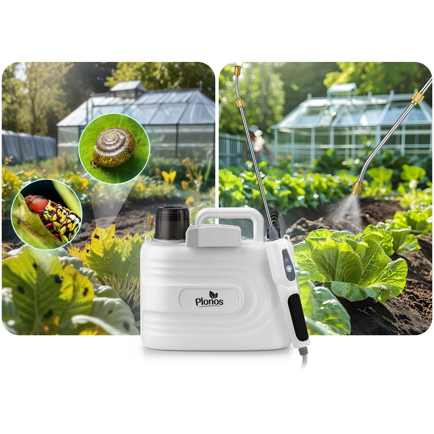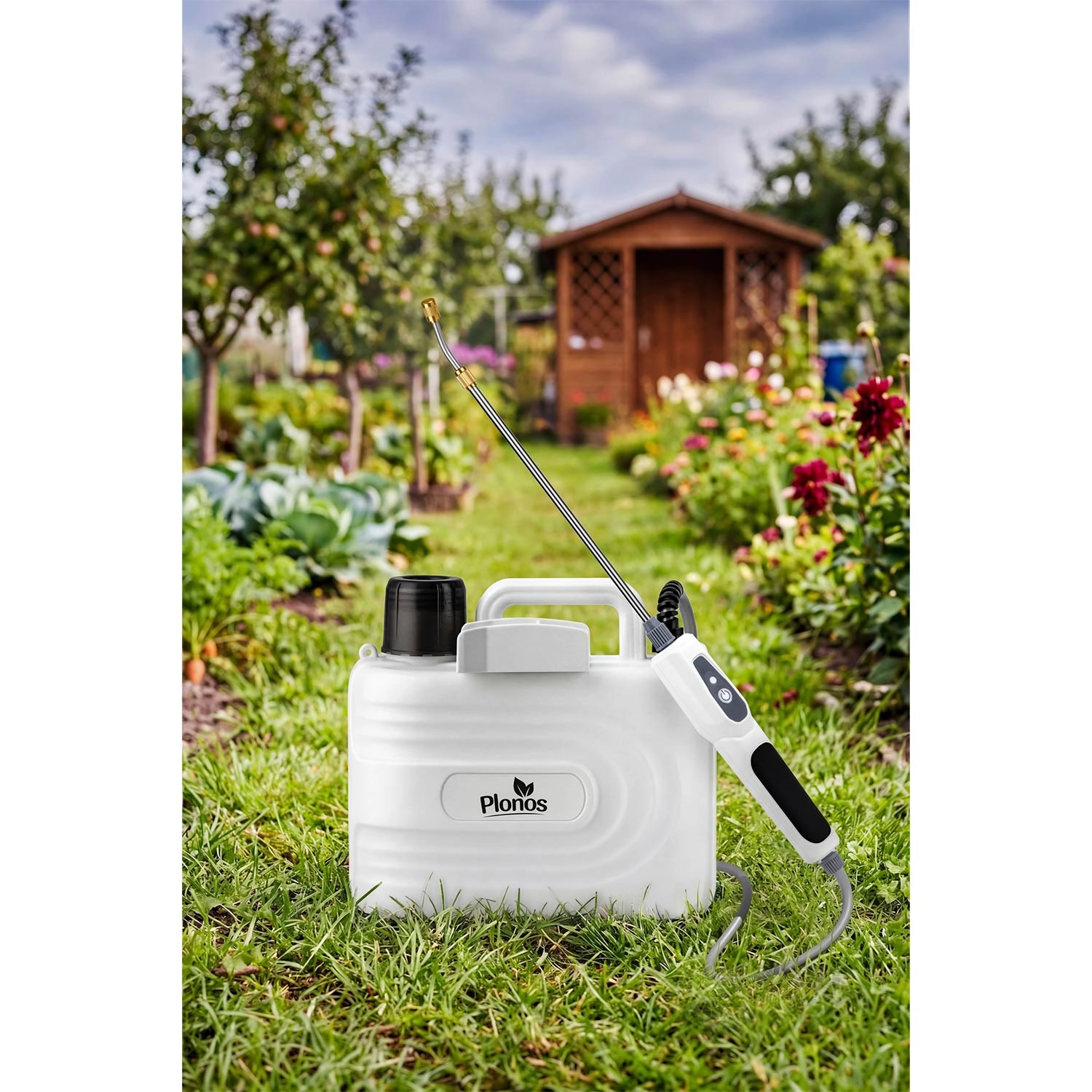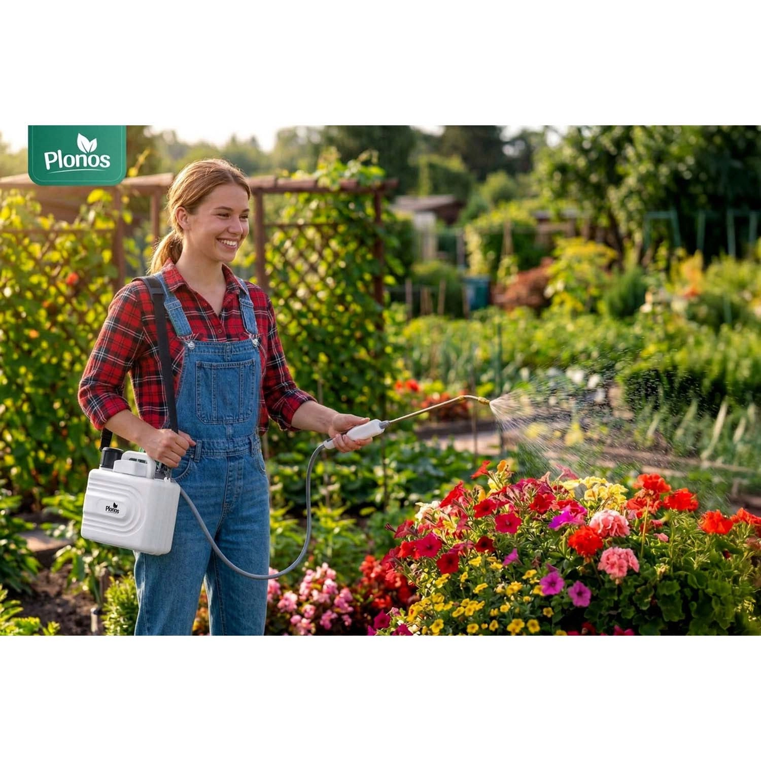 Razpršilnik za zahtevne vrtnarje – akumulatorski tlačni razpršilnik PLONOS 5 l združuje mobilnost, moč in natančnost. Z enim pritiskom na gumb zaženete enakomerno razprševanje brez ročnega črpanja, kar prihrani čas in trud. Nerjaveča jeklena palica in medeninasta šoba omogočata tekoče nastavljanje od fine megle do neprekinjenega curka, zato zlahka prilagodite nanos gnojil in sredstev proti škodljivcem.