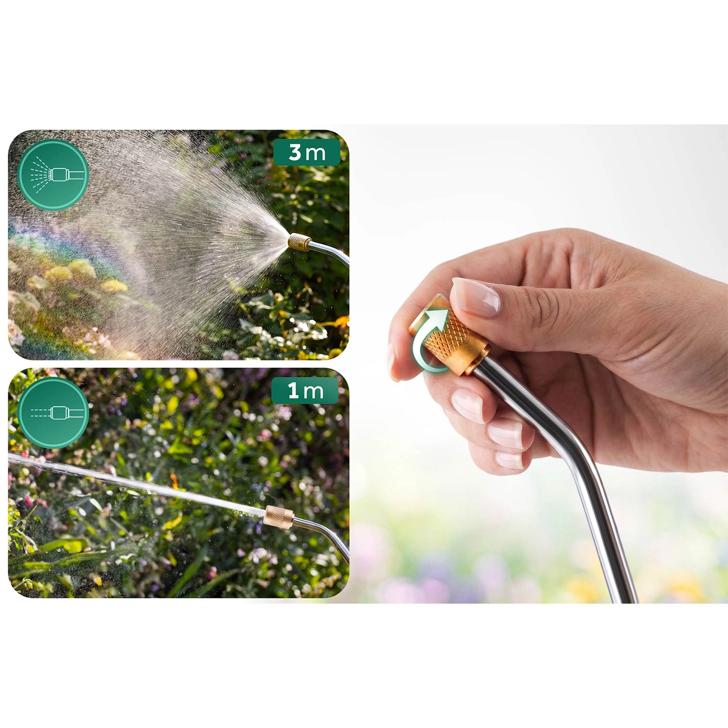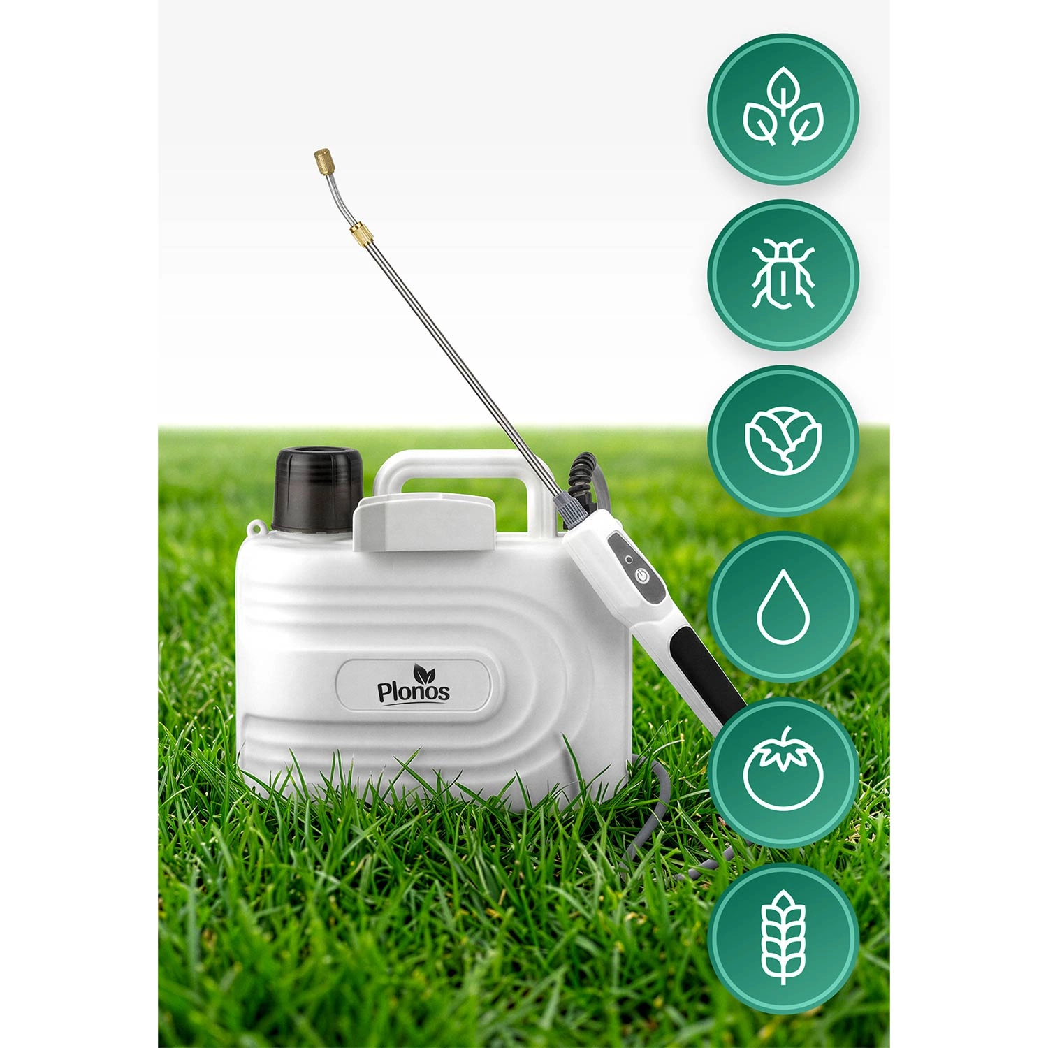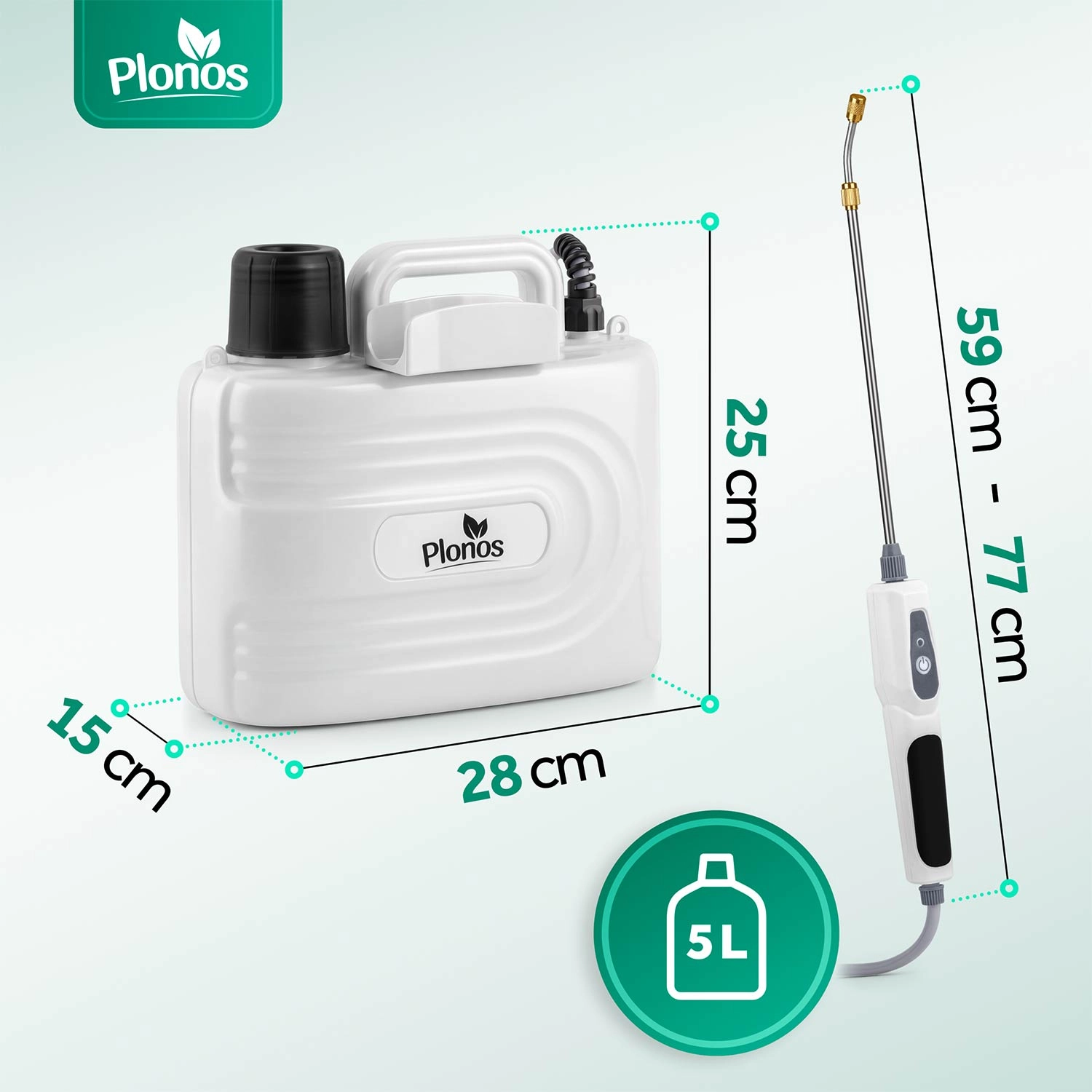 Razpršilnik za zahtevne vrtnarje – akumulatorski tlačni razpršilnik PLONOS 5 l združuje mobilnost, moč in natančnost. Z enim pritiskom na gumb zaženete enakomerno razprševanje brez ročnega črpanja, kar prihrani čas in trud. Nerjaveča jeklena palica in medeninasta šoba omogočata tekoče nastavljanje od fine megle do neprekinjenega curka, zato zlahka prilagodite nanos gnojil in sredstev proti škodljivcem.