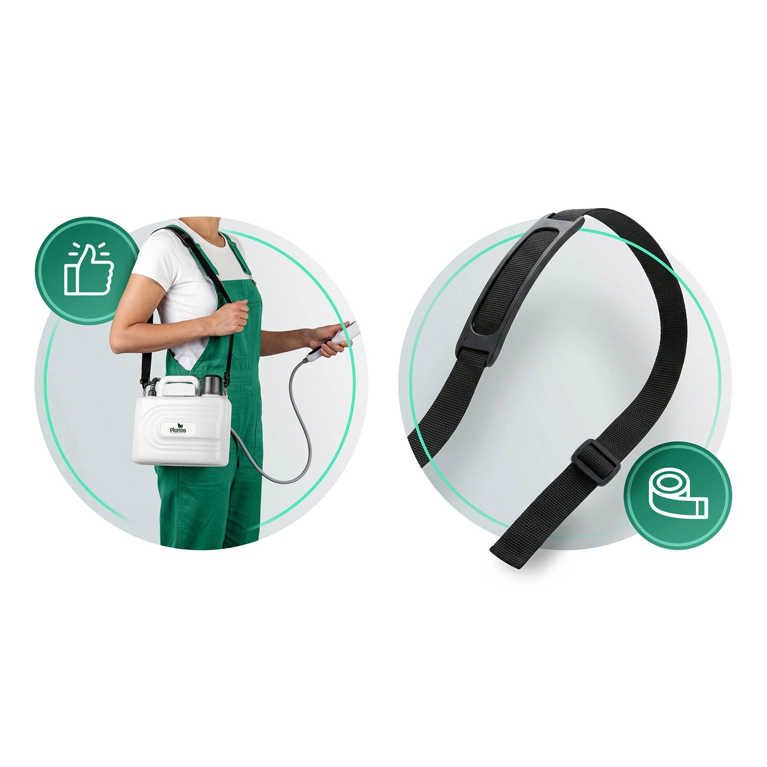 Udobje in zanesljivost pri vsaki uporabi zagotavljajo široke podložene nastavljive naramnice, pregleden LED indikator stanja napolnjenosti in filtrirno sito proti nečistočam. Trpežen PE rezervoar 5 l je lahek in kemično odporen, primeren za vrt, rastlinjak in večje travnate površine. Stalen tlak prinaša enakomerno prekrivnost in varčno porabo pripravkov.