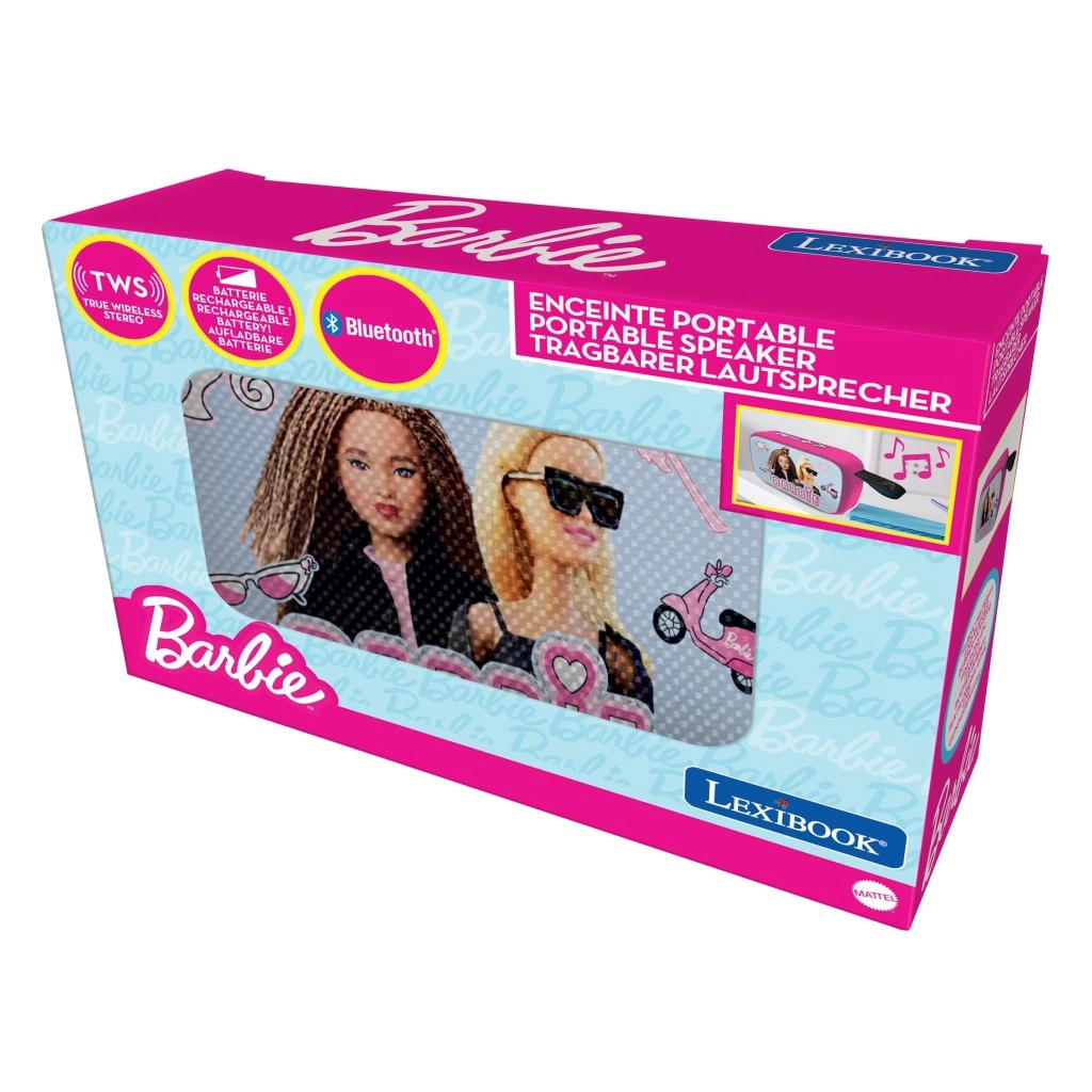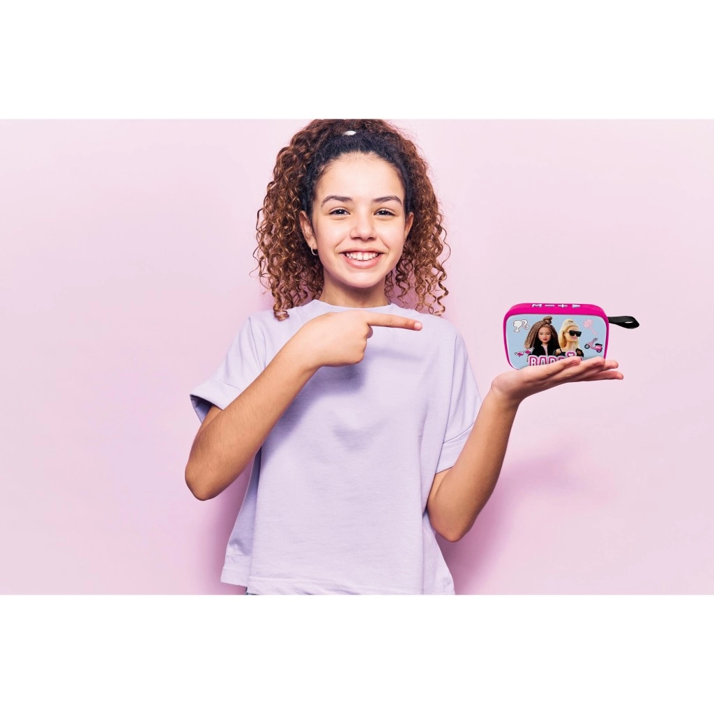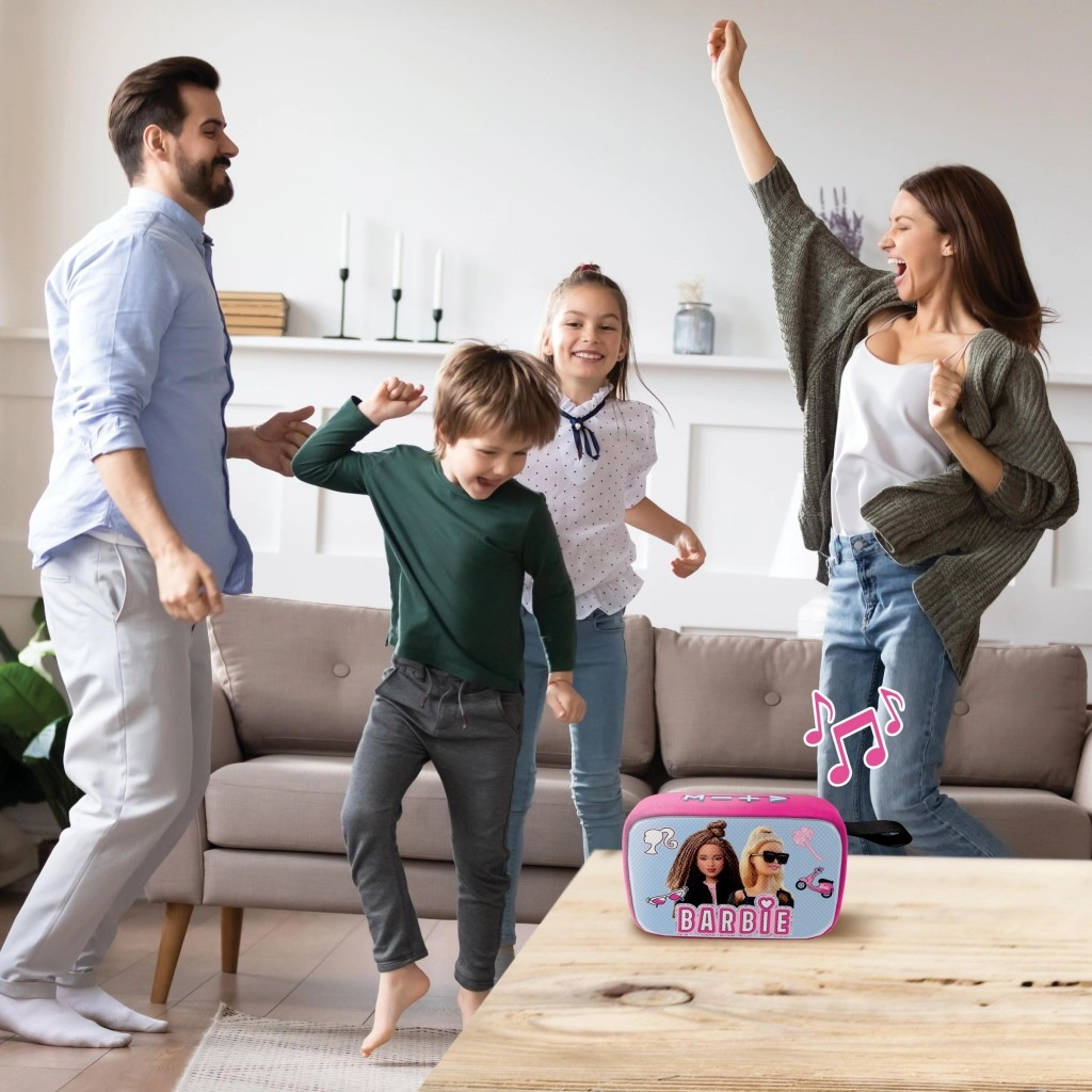 Otroški zvočnik LEXIBOOK z motivom BARBIE prinaša brezžično predvajanje prek Bluetootha, možnost TWS za stereo zvok in kompaktno, lahko zasnovo z blagom prevlečeno površino. Ponuja preprosto upravljanje, režo za pomnilniško kartico in polnilno baterijo v paketu – idealno za doma in na poti.