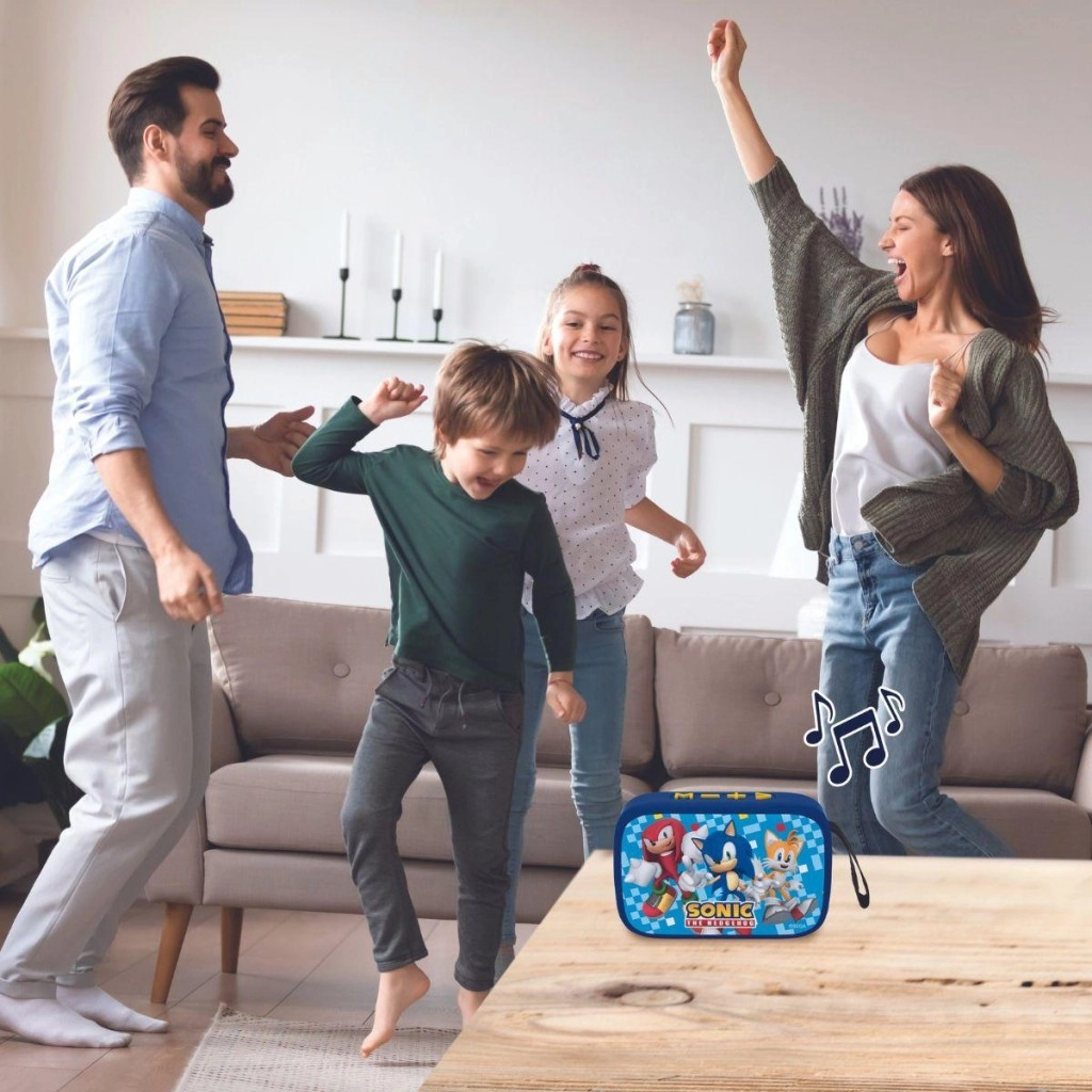 Razveselite otroke s stilskim zvočnikom Lexibook s priljubljeno tematiko SONIC the Hedgehog. Barvit tekstilni sprednji del z liki Sonic, Tails in Knuckles, modro ohišje in rumeni gumbi pritegnejo na prvi pogled, preprosto upravljanje pa bo navdušilo mlajše in starejše poslušalce.