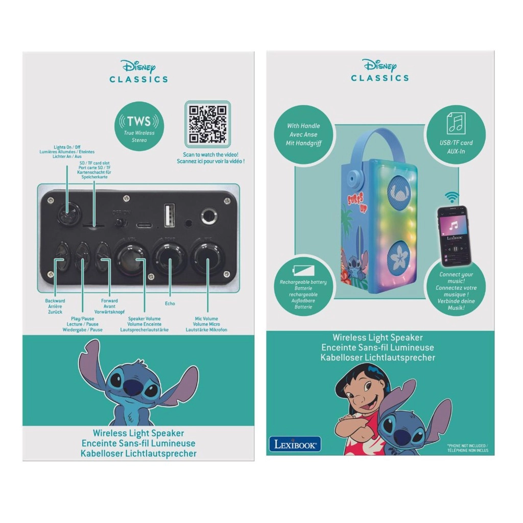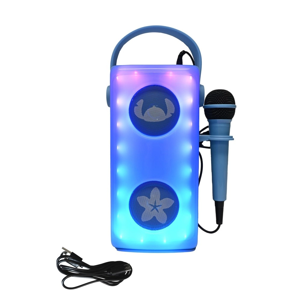 Otroški karaoke zvočnik LEXIBOOK s simpatičnim motivom STITCH je prenosen, zabaven in preprost za uporabo – popoln spremljevalec za male pevce. Ponuja Bluetooth povezavo, predvajanje z USB, Micro SD/TF in prek AUX-IN, del kompleta pa je tudi žični mikrofon z upravljanjem ter barvni LED učinki za odlično vzdušje. Zahvaljujoč polnilni NiMH bateriji, praktičnemu ročaju in trpežni zasnovi je idealen za dom in otroške zabave.