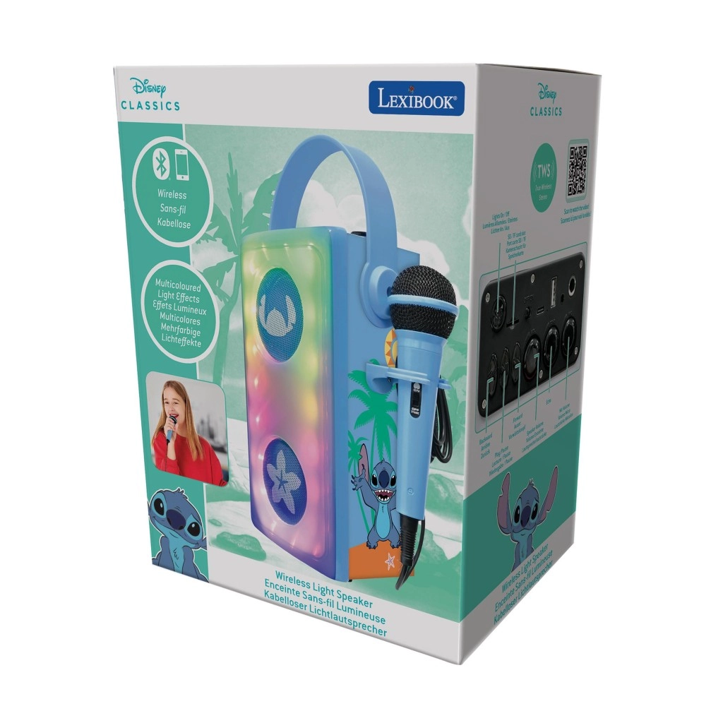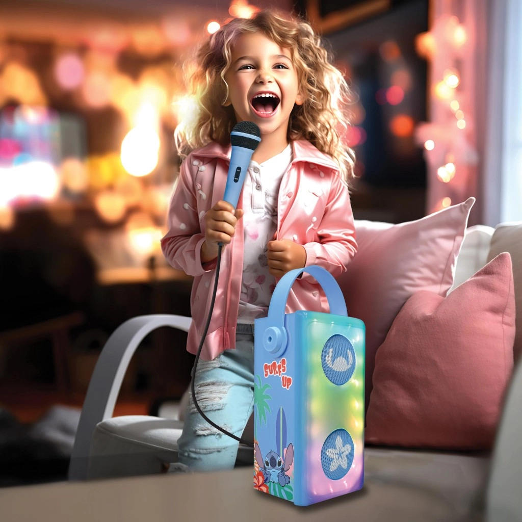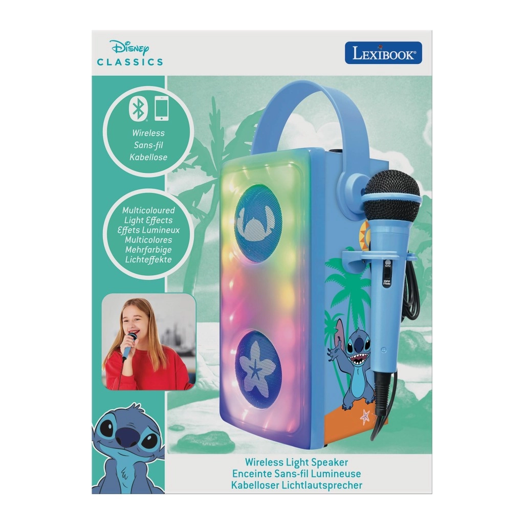 Popestrite otroške zabave in domače koncerte s stilskim karaoke zvočnikom LEXIBOOK z motivom STITCH. Dva sprednja gonilnika z dekorativnimi mrežicami in večbarvno LED osvetlitvijo ustvarita privlačno svetlobno predstavo, priloženi mikrofon pa spodbuja ustvarjalnost in samozavest otrok pri petju.