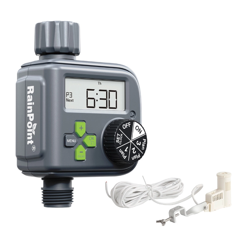 Vgrajeni žični dežni senzor ob padavinah ustavi vse cikle in po osušenju samodejno obnovi program. Tako zmanjšuje prekomerno namakanje gredic in optimizira porabo vode.