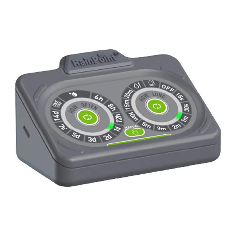 Preprosto upravljanje omogoča izbiro trajanja delovanja 15 s–20 min in frekvence od 6 ur do 14 dni, po potrebi tudi enkratni zagon. LED‑indikatorji nadzirajo delovanje in nizek nivo vode, povratni (antisifonski) ventil in filter pa ščitita sistem pred nečistočami.