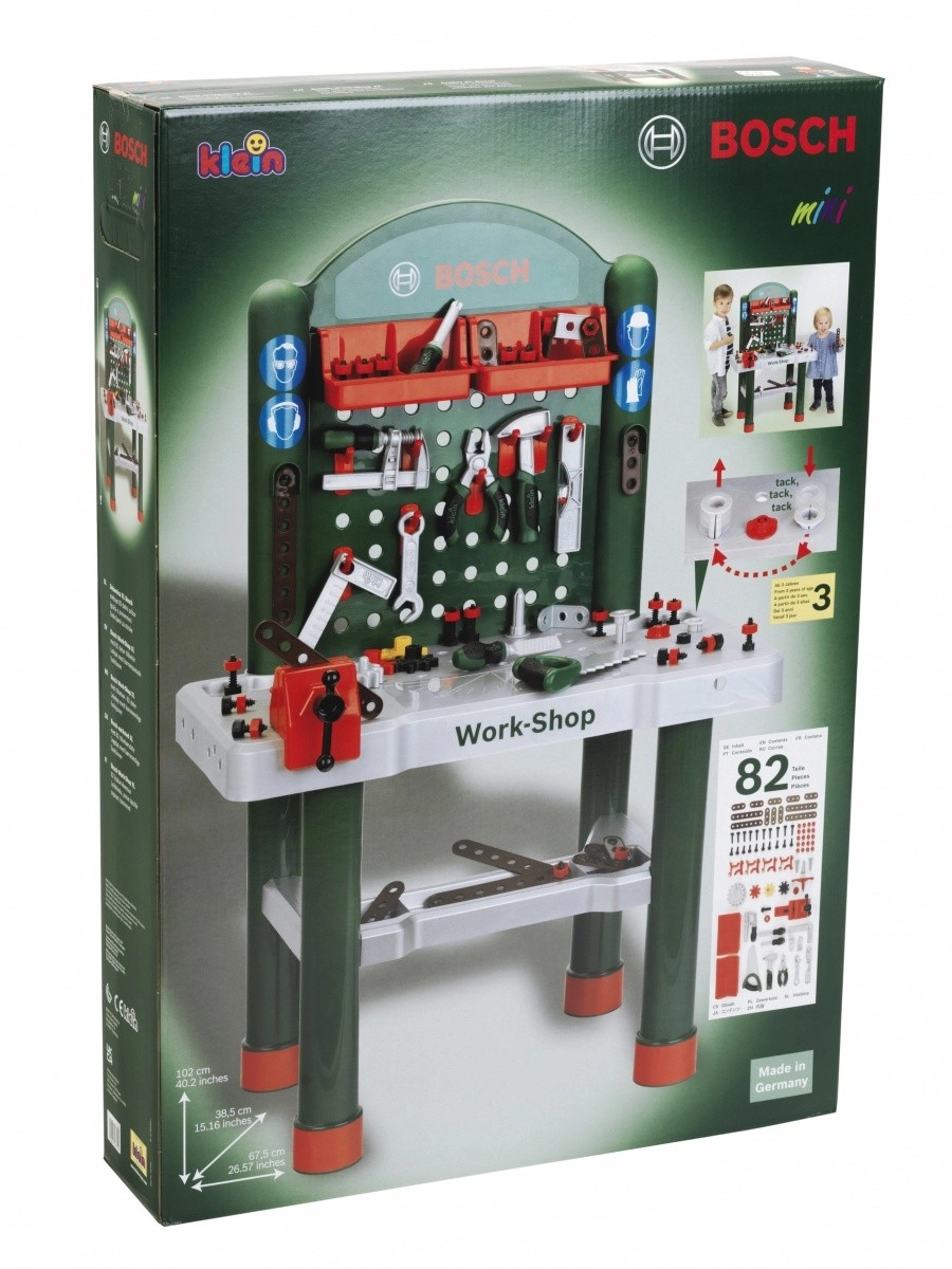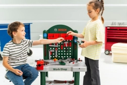 Ta popolnoma opremljena delovna miza za otroke z uradno licenco BOSCH spremeni sobo v majhno delavnico. Pregledno shranjevanje zagotavljajo perforirana zadnja stena s kavlji, polica pod ploščo in 3 praktične škatle za drobnarije. Ne manjka niti funkcionalni otroški primež za trden prijem delov in stabilna delovna površina.