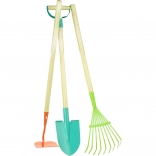 Lopata, grablje in motika pokrijejo kopanje, grabljenje in rahljanje prsti – idealno za učenje nege gredic in rastlin.