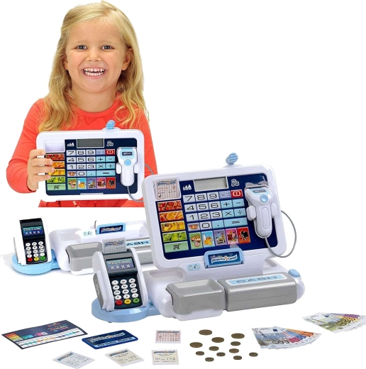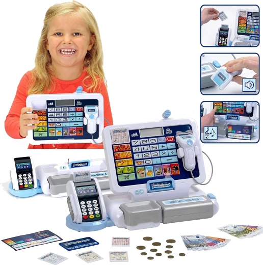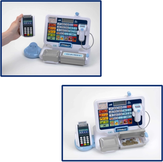 Elektronska blagajna za otroke posnema pravo blagajno: ima pregleden zaslon s kalkulatorjem, čitalnik kartic, skener in nagibni predal za gotovino z znanim »klikom«. Otroci lahko »skenirajo« izdelke, vnesejo cene in pustijo blagajni, da vse samodejno sešteje. Sivo-bela barvna izvedba deluje moderno in čisto.