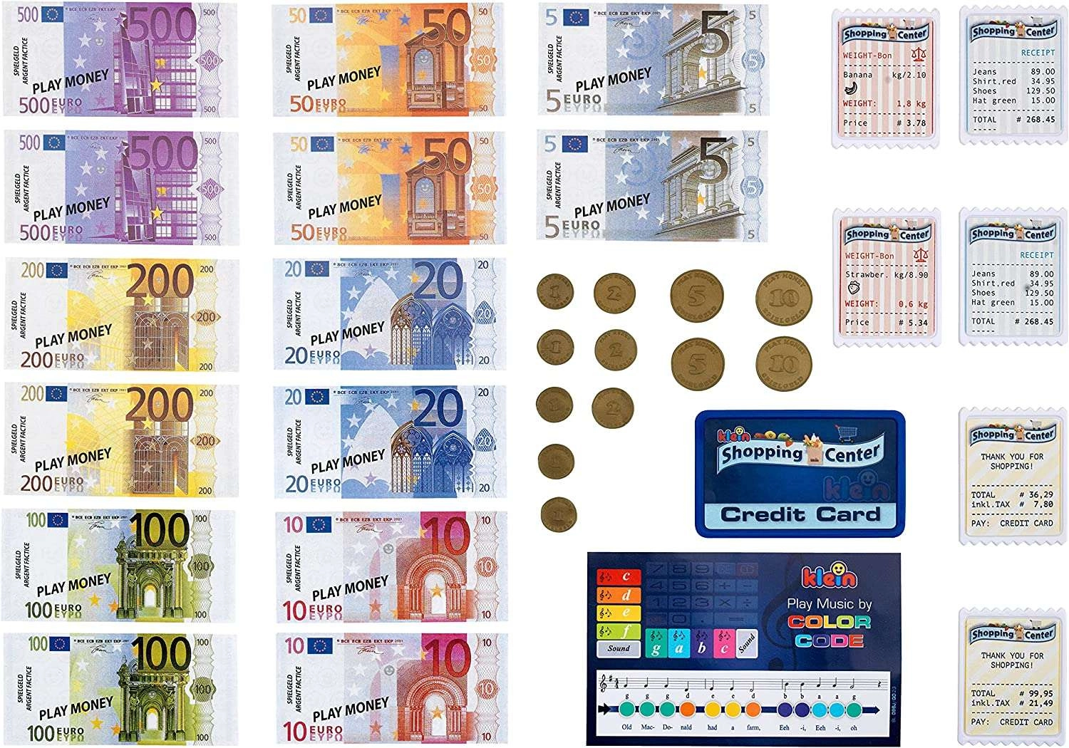 Priložen je bogat komplet dodatkov: evrski kovanci in bankovci različnih apoenov, računi, plačilna kartica in kartica s pesmicami za še zabavnejšo igro. Blagajna je odlična izbira za otroke od 3 let, ki imajo radi igro trgovine in želijo vaditi računanje, fino motoriko ter komunikacijo s strankami.
