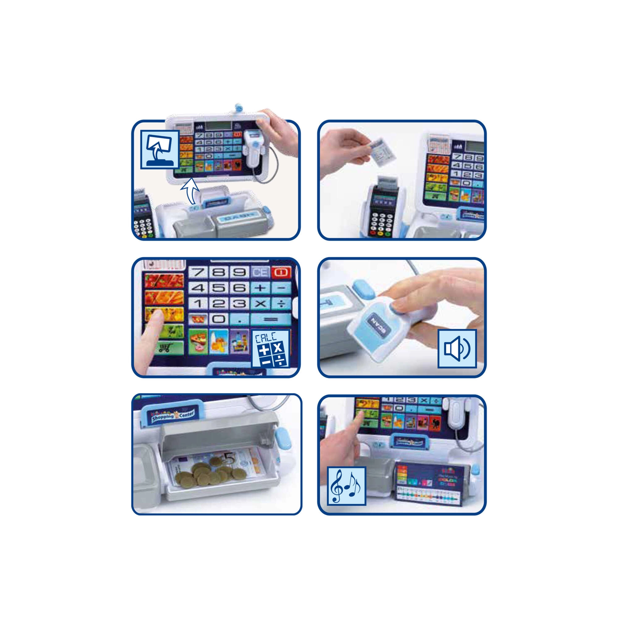 • Realistične funkcije: zaslon s kalkulatorjem, skener, čitalnik kartic, zvoki blagajne.