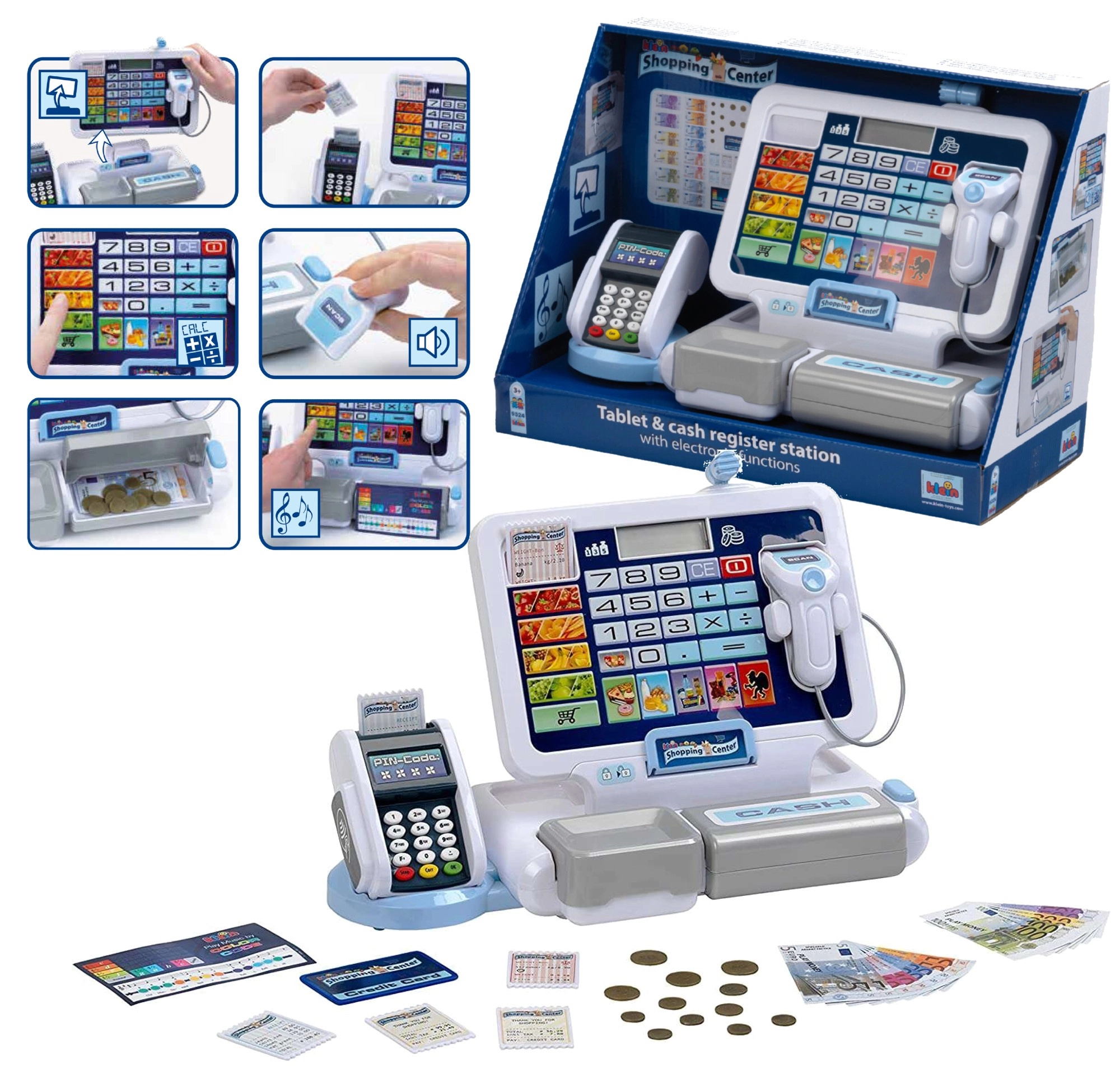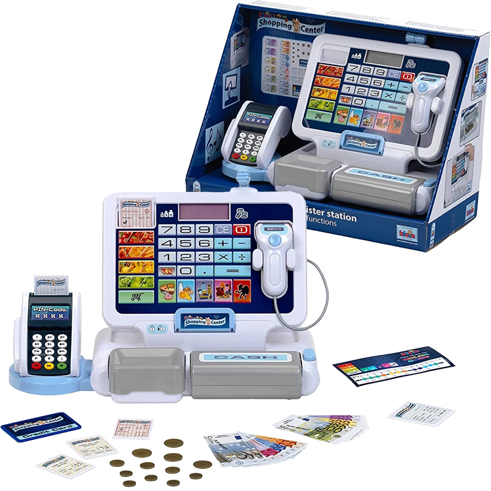 Realistična otroška blagajna s terminalom in skenerjem znamke KLEIN prinaša pristno igro trgovine. Ponuja delujoč zaslon s kalkulatorjem, odpirajoči se predal za denar, čitalnik kartic, zvočne učinke in bogate dodatke, vključno z evrskimi kovanci in bankovci, računi ter »kreditno« kartico – idealno za razvoj računanja, finančne pismenosti in vlogovnih iger.