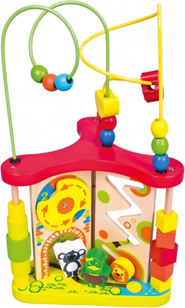 Ta večnamenski lesen aktivnostni labirint znamke Bino je zasnovan tako, da otroke zabava in hkrati razvija. Kroglice na kovinskih žicah, vrtljivi in premični elementi ter ilustrirani motivi živalic spodbujajo radovednost, zbranost in koordinacijo oko–roka.