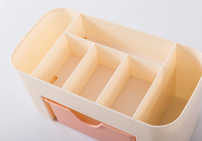 Odličen za organizacijo ličil, nakita in drugih malenkosti, ta organizator je opremljen s predalom in šestimi predelki različnih velikosti.