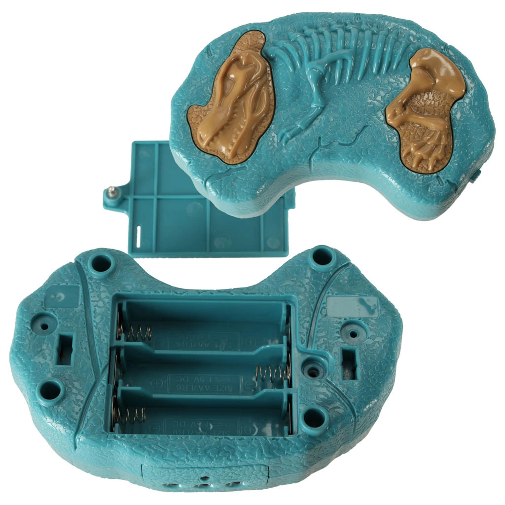 Daljinski upravljalnik, ki spominja na fosil, s dvema gumboma olajša upravljanje gibov in zvokov dinozavra.
