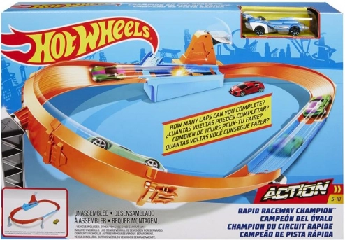Vse potrebno je v škatli: oranžne tire, izstreljevalnike, zavoje, dekorativne zastavice in 1 avtomobilček za takojšnjo igro. Robustni plastični deli prenesejo intenzivno akcijo ter razvijajo fino motoriko, koordinacijo oko–roka in kreativnost.
