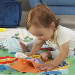 Ta mehka in prostorna igralna podloga z očarljivim zunanjim motivom vzbuja radovednost in naravno podpira razvoj otroka. Zahvaljujoč priloženim igračam se dojenček dolgo zabava, hkrati pa krepi vratne in hrbtne mišice ter razvija finomotoriko.