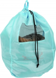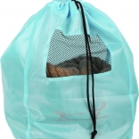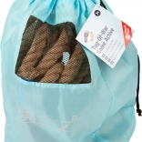 Vrečka turkizne barve z mrežastim okencem omogoča enostavno prenašanje in shranjevanje vrvi po igri.