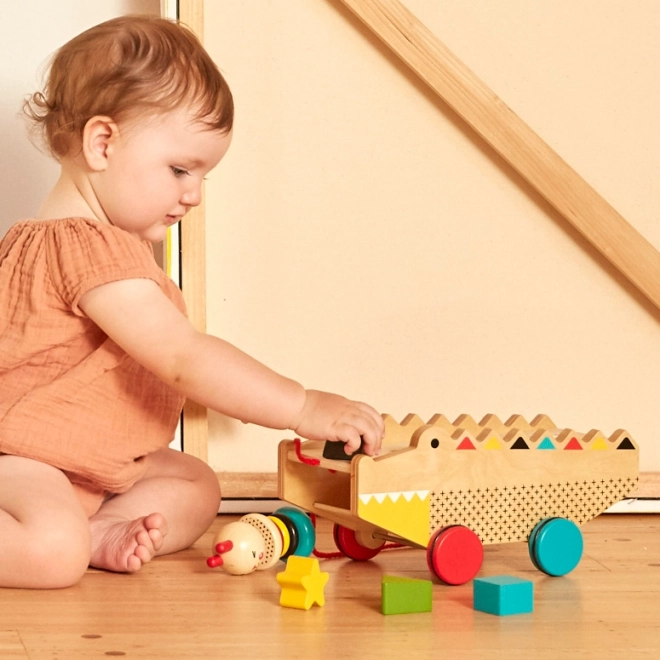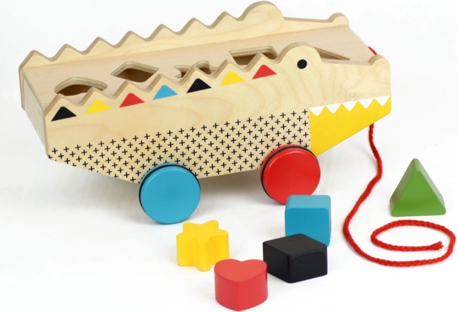 Ta leseni vlečni aligator z vstavljanko je idealna igrača za male raziskovalce od 18 mesecev naprej. Pet robustnih oblik otroci enostavno vstavljajo v ustrezne odprtine, s čimer razvijajo koordinacijo roka–oko in logično razmišljanje. Zahvaljujoč praktični vlečni vrvici in gumiranim kolescem bodo uživali v obilici aktivne zabave doma in na poti.