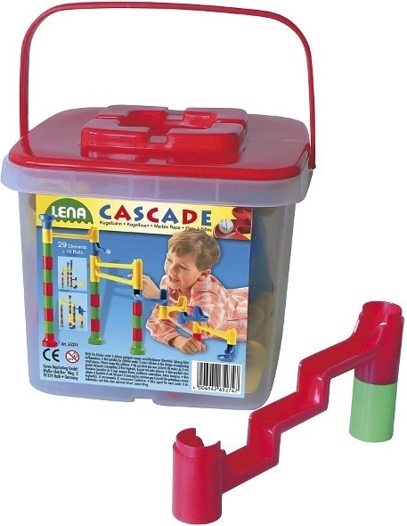 Gradbeni set Cascade prinaša barvito kaskado zabave. Iz 29 delov je mogoče ustvariti različne kroglične proge, po katerih kroglica šviga prek različnih nivojev in ovir. Praktično vedro z ročajem olajša shranjevanje in prenašanje, zato se lahko otroci igrajo doma ali na poti.