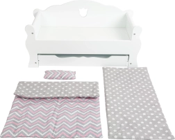 Ta elegantna posteljica za punčke ali plišaste igrače združuje slog in praktičnost. Izdelana je iz kakovostnega lesa, ki zagotavlja dolgo življenjsko dobo in stabilnost. Vključuje vzmetnico, odejico in blazino ter nudi maksimalno udobje za punčko dolžine do 45 cm.