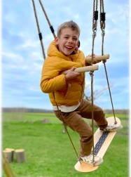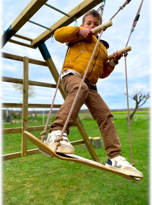 Robustna lesena ročaja na vrveh lahko preprosto nastavite na idealno višino. Pruža oporo pri skakanju na desko in guganju v stoje.