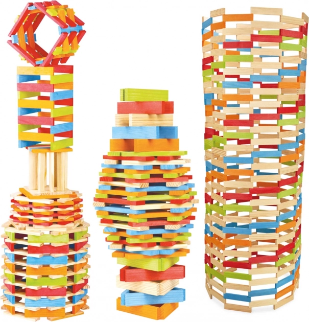 Izdelek je natančno izdelan v Franciji iz masivnega bukovega in borovega lesa. Uporabljene barve in laki so na vodni osnovi, kar zagotavlja varnost za otroke in okolje. Praktičen komplet je pakiran v kartonskem vedru, potiskanem z rastlinskimi črnili, ki vsebuje tudi brošure z navdihi za raznolike gradnje.