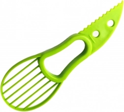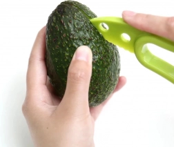 Odkrijte preprost način za pripravo avokada v nekaj sekundah. Ta večnamenski pripomoček združuje ostro plastično rezilo za vzdolžno prerezovanje, poseben del za varno odstranjevanje koščice in praktično stran za hitro izdolbenje in rezanje sredice na rezine.