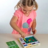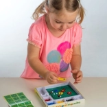 Ta mozaik je odlična izbira za prve ustvarjalne korake. Otroci s pomočjo pincete vstavljajo barvite kroglice v podlogo in ustvarjajo preproste ali domiselne motive. Aktivnost spodbuja potrpežljivost, koordinacijo oko–roka in razvoj fine motorike.