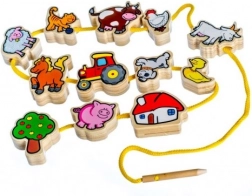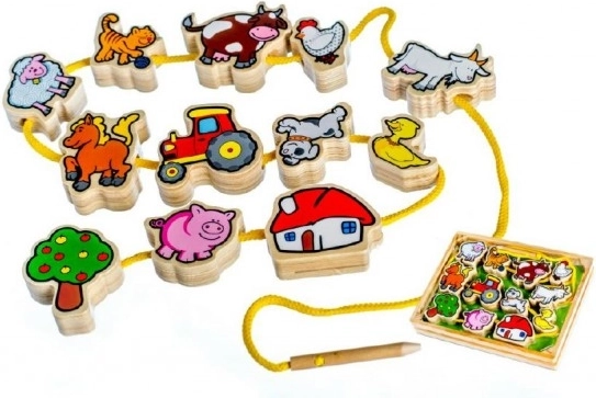 Set vsebuje 12 lesenih delov, leseno iglo, bombažno vrvico in leseno sponko. Veseli in barviti motivi so zasnovani tako, da pritegnejo otroško pozornost in so odličen pripomoček za učenje in igro.