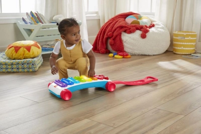 Velik izobraževalni ksilofon Fisher-Price je nova različica klasične glasbene vlečne igrače, zdaj z še več zabave! Ta izjemno velik interaktivni ksilofon ponuja 8 osvetljenih tipk, ki sprožijo več kot 60 zvočnih aktivacij, vključno z različnimi zvoki, pesmimi in izjavami. Igrača je opremljena z robustnim zložljivim ročajem, da se lahko mali glasbeniki igrajo sede ali jo vlečejo na sprehodu. Tehnologija stopenj učenja omogoča prilagajanje načina igre, ko otrok raste. Izobraževalne fraze in pesmi učijo med drugim abecedo, številke in oblike, pa tudi preproste besede v angleščini. Pritisnite gumb z globusom za izbiro jezika: češčina, poljščina, madžarščina, slovaščina ali angleščina.