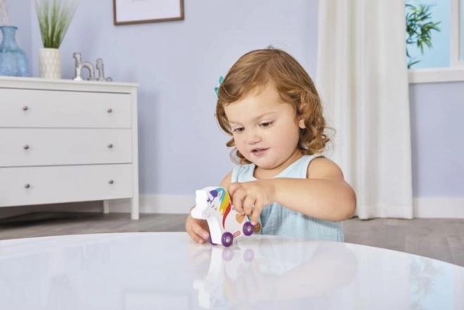 Igrača je opremljena s štirimi funkcionalnimi kolesci, ki omogočajo enostavno rokovanje in premikanje. Idealna je za razvoj grobe motorike in domišljije otrok že od 12 mesecev dalje.