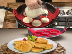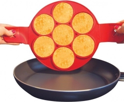 Ta večnamenski pekač iz silikona, primernega za stik z živili, olajša pripravo zajtrkov in hitrih večerij. Preprosto ga položite na ponev, napolnite odprtine s testom in po zapečenju s pomočjo stranskih ročajev obrnite – dobili boste enakomerno pečene in popolne oblike brez razlitja testa.