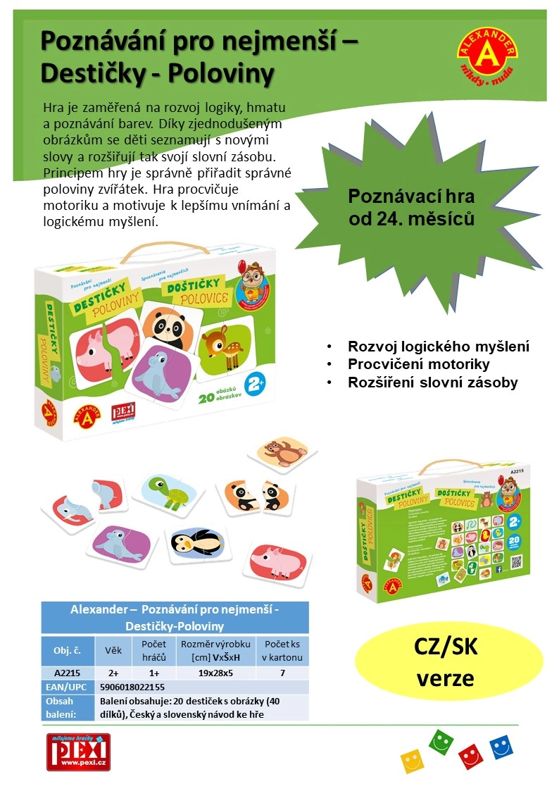 Ta preprosta in pametna igra ALEXANDER je zasnovana za najmlajše raziskovalce. Otroci pravilno prirejajo polovice živalic in pri tem urijo logiko, tip ter zaznavanje barv. S poenostavljenimi sličicami spoznavajo nova besedila in na nevsiljiv način razvijajo besedni zaklad.