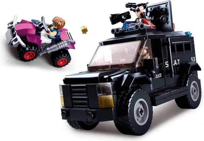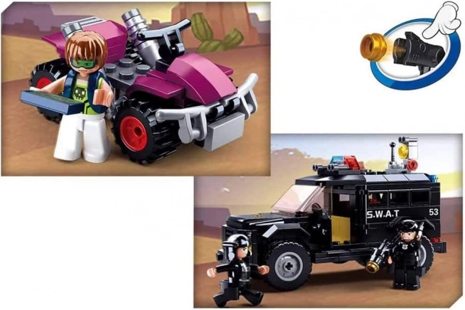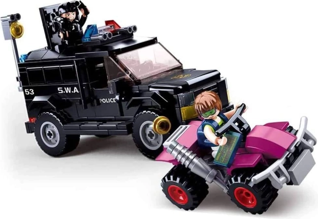Ta akcijski gradbeni komplet SLUBAN POLICE prinaša vse za dramatično policijsko akcijo: robustno vozilo SWAT, ubežnikov ATV štirikolesnik in tri podrobno izdelane figurke z dodatki. Zahvaljujoč kakovostni plastiki ABS je model trpežen in pripravljen na dolge ure igre.