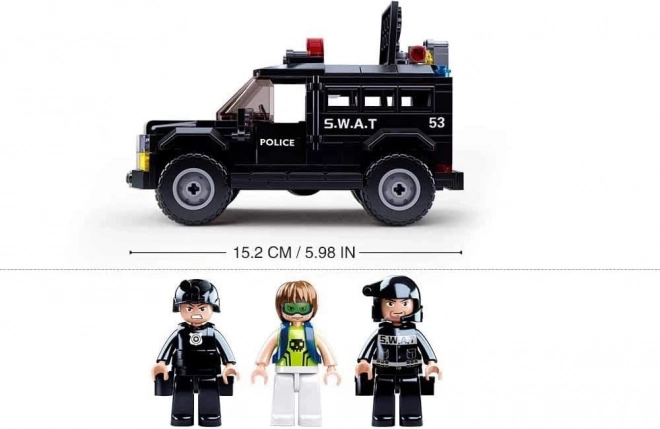 Črno policijsko vozilo s streho za figurko, napisoma S.W.A.T. in realističnimi elementi, kot so luči, ogledala in robustna kolesa.