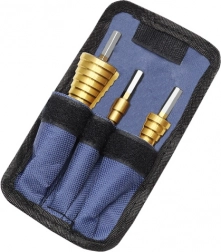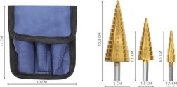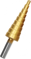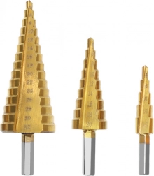 Stopničasti svedri so idealni za hitro izdelavo različnih premerov z enim orodjem. Zahvaljujoč več stopnjam na vsakem svedru lahko odprtino enostavno razširite na želeno velikost brez menjave orodja. Titanova prevleka zmanjšuje trenje, podaljšuje življenjsko dobo in izboljšuje kakovost reza.
