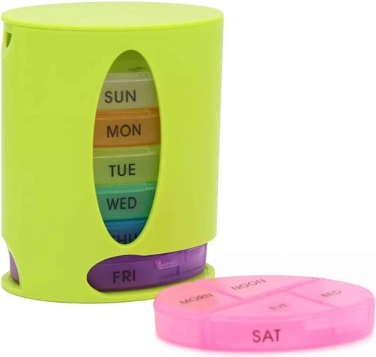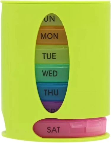 Ta tedenski organizator za zdravila pomaga ohranjati rednost in preglednost pri uživanju zdravil ali prehranskih dopolnil. Vsak dnevni predalček je barvno razlikovan in označen z imenom dneva, kar zagotavlja hitro orientacijo ter zmanjšuje tveganje izpuščene doze.