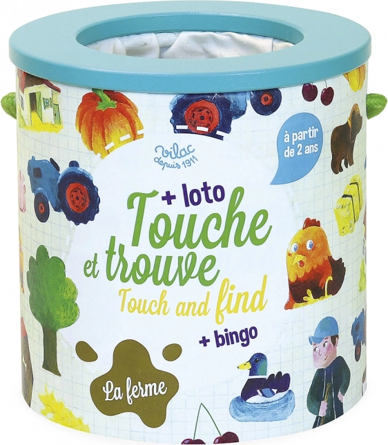 Igra Vilac Dotakni se in najdi - Kmetija je idealna za razvoj fine motorike in občutka za dotik pri otrocih. Igralci morajo z dotikom uganiti, kateri predmeti so v vedru. Za starejše otroke igra ponuja različico lota ali binga s priloženimi slikovnimi kartami predmetov.